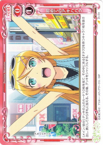 ![]() ![]() | P-012 高坂 桐乃 Character 俺の妹がこんなに可愛いわけがない プロモーションカード 色:黄 特徴:制服/オタク 使用コスト:2 発生コスト:2 AP:30 DP:30 このカードが登場、または相手のアプローチによって衣自分のポイント置き場に置かれた場合、デッキの上のカード5枚を見て、その中にある「高坂 桐乃」1枚を抜き出し、表にしてから手札に加える。その後、残りのカードを任意の順番でデッキの下に移す。 あたしを好きになってくれて・・・・・・、ありがと・・・・・・。 作品名:俺の妹がこんなに可愛いわけがない。 |