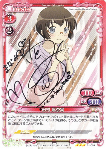 ![]() ![]() | 01-054 田村 麻奈実 Character 俺の妹がこんなに可愛いわけがない ブースターパック R(銀サイン) 色:赤 特徴:メガネ 使用コスト:3 発生コスト:2 AP:10 DP:40 このカードは、相手のアプローチでポイント置き場に置かれるごとに、ターン終了時まで+10/+10を得る。その後、このカードを活動状態にすることができる。 桐乃ちゃんごめんね。突然来ちゃって。 illust:Madoka Tanada 作品名:俺の妹がこんなに可愛いわけがない |