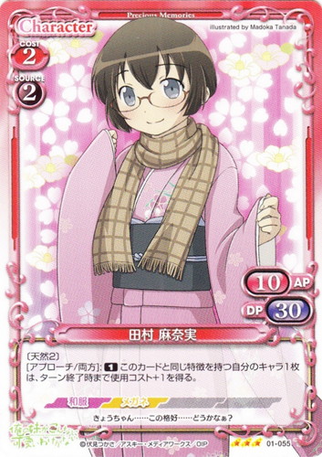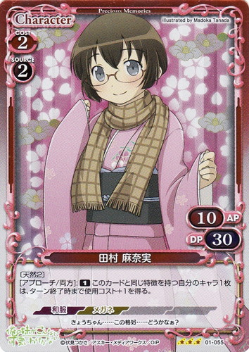 ![]() ![]() | 01-055 田村 麻奈実 Character 俺の妹がこんなに可愛いわけがない ブースターパック R 色:赤 特徴:和服/メガネ 使用コスト:2 発生コスト:2 AP:10 DP:30 〔天然2〕 [アプローチ/両方]:[1]このカードと同じ特徴を持つ自分のキャラ1枚は、ターン終了時まで使用コスト+1を得る。 きょうちゃん・・・・・・この格好・・・・・・どうかなぁ? illust:Madoka Tanada 作品名:俺の妹がこんなに可愛いわけがない |