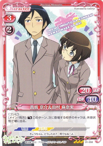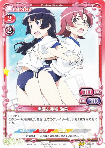 ![]() ![]() | 01-029 黒猫&高坂 桐乃 Character 俺の妹がこんなに可愛いわけがない ブースターパック C(foil) 色:青 特徴:コスプレ/オタク/メガネ 使用コスト:3 発生コスト:1 AP:30 DP:40 〔コンビ〕 このカードがアプローチに参加した場合、【オタク】を持たないキャラ1枚は、ターン終了時まで-10/-10を得る。 アキバのオフ会にそのファッションはありえないわ。 作品名:俺の妹がこんなに可愛いわけがない |