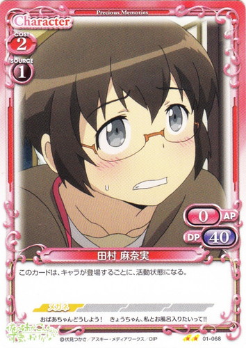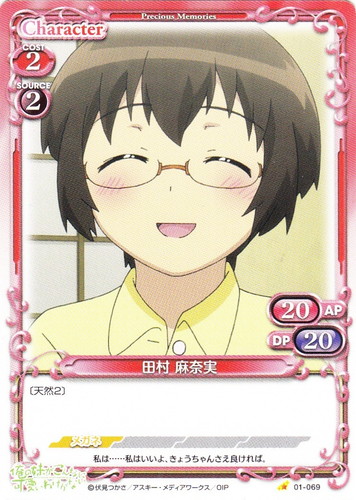 ![]() ![]() | 01-069 田村 麻奈実 Character 俺の妹がこんなに可愛いわけがない ブースターパック C 色:赤 特徴:メガネ 使用コスト:2 発生コスト:2 AP:20 DP:20 〔天然2〕 私は・・・・・・私はいいよ、きょうちゃんさえ良ければ。 作品名:俺の妹がこんなに可愛いわけがない |