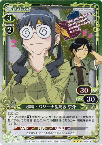 ![]() ![]() | 03-031 沙織・バジーナ&高坂 桐乃 Character 俺の妹がこんなに可愛いわけがない。スペシャルパックPart.2 U(foil) 色:緑 特徴:オタク/メガネ/お嬢様 使用コスト:1 発生コスト:2 AP:20 DP:20 〔コンビ〕 このカードが登場した場合、相手の手札全てを見る。 そんなストーカー行為がお役に立ったようでなによりです。 作品名:俺の妹がこんなに可愛いわけがない。 |