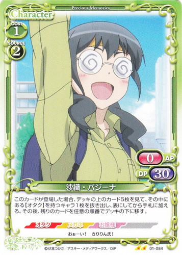 ![]() ![]() | 01-084 沙織・バジーナ Character 俺の妹がこんなに可愛いわけがない ブースターパック U 色:緑 特徴:オタク/メガネ/お嬢様 使用コスト:1 発生コスト:2 AP:0 DP:30 このカードが登場した場合、デッキの上のカード5枚を見て、その中にある【オタク】を持つキャラ1枚を抜き出し、表にしてから手札に加える。その後、残りのカードを任意の順番でデッキの下に移す。 おぉーい!きりりん氏! 作品名:俺の妹がこんなに可愛いわけがない |