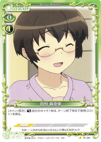 ![]() ![]() | 01-091 田村 麻奈実 Character 俺の妹がこんなに可愛いわけがない ブースターパック C 色:緑 特徴:メガネ 使用コスト:0 発生コスト:1 [メイン/両方]:[休息]自分のキャラ1枚は、ターン終了時まで使用コスト+1を得る。 その・・・・・・これからは『おにいちゃん』って呼んだ方がいい? 作品名:俺の妹がこんなに可愛いわけがない |
