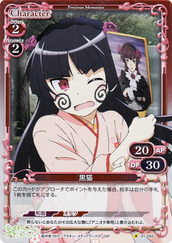 ![]() ![]() | 01-050 黒猫 Character 俺の妹がこんなに可愛いわけがない ブースターパック C(foil) 色:赤 特徴:和服/オタク 使用コスト:2 発生コスト:2 AP:20 DP:30 このカードがアプローチでポイントを与えた場合、相手は自分の手札1枚を捨て札にする。 黙らないとあなたのその広大な額に『アニオタ専用』と書き込むわよ。 作品名:俺の妹がこんなに可愛いわけがない |