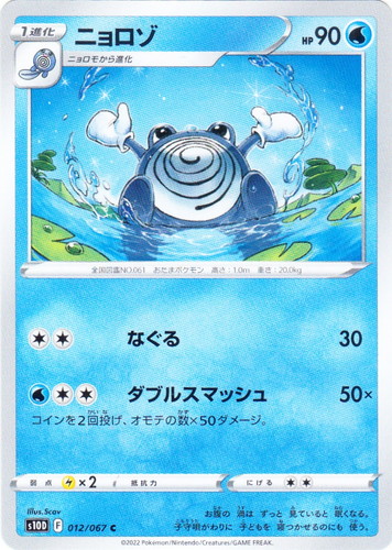 ![]() ![]() | No.060 ニョロモ ポケモン ポケットモンスターカードゲーム 第1弾 拡張パック ● タイプ:水 分類:たね LV:13 HP:40 [水] みずでっぽう 10+ 「水」エネルギーを1つ追加すると10ダメージ追加できる。(追加は2つまで) にげる:[無色] 弱点:草 おたまポケモン:身長0.6m、体重12.4Kg スベスベした黒い皮膚は薄く湿っている。内臓の一部が透けて渦巻状にみえる。 illust:Ken Sugimori |