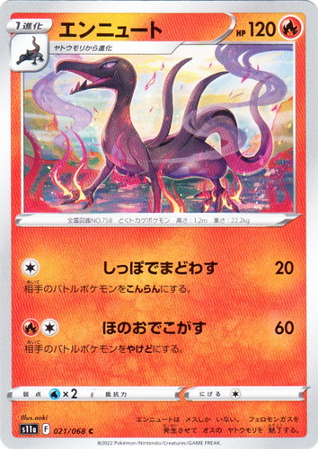 ![]() ![]() | SV4a 110 キラーメ ポケモン スカーレット&バイオレット ハイクラスパック シャイニートレジャーex タイプ:闘 分類:たね HP:40 レギュレーション:G [闘] かくせい このポケモンから進化するカードを、自分の山札から1枚選び、このポケモンにのせて進化させる。そして山札を切る。 弱点:草×2 にげる:[無色] 全国図鑑NO.0969 こうせきポケモン 高さ:0.7m 重さ:8.0kg 洞窟の 壁から 栄養分を 吸収。 毒の 結晶で できた 花びらを 身にまとう。 illust:Mizue |