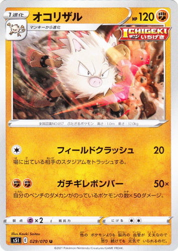 ![]() ![]() | SV4a 101 オコリザル ポケモン スカーレット&バイオレット ハイクラスパック シャイニートレジャーex (ミラー) タイプ:闘 分類:1進化 HP:90 レギュレーション:G マンキーから進化 [闘] あばれパンチ 70 このポケモンにも20ダメージ。 弱点:超×2 にげる:[無色] 全国図鑑NO.0057 ぶたざるポケモン 高さ:1.0m 重さ:32.0kg ある研究者の 学説では モンスターボールの 中でも オコリザルは 怒っているらしい。 illust:Ryuta Fuse |