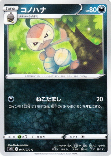 ![]() ![]() | SV4a 140 プリン ポケモン スカーレット&バイオレット ハイクラスパック シャイニートレジャーex タイプ:無色 分類:たね HP:70 レギュレーション:G [無色] みちびく 自分の山札からサポートを1枚選び、相手に見せて、手札に加える。そして山札を切る。 [無色][無色] ふみふみ 20× コインを2回投げ、オモテの数×20ダメージ。 弱点:闘×2 にげる:[無色] 全国図鑑NO.0039 ふうせんポケモン 高さ:0.5m 重さ:5.5kg つぶらな 瞳が 揺れるとき 眠たくなるような 不思議で 気持ちのいい 歌を 歌う。 illust:saino misaki |
