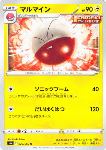 ![]() ![]() | No.081 マチスのコイル ポケモン ポケットモンスターカードゲーム ジム拡張 第1弾 リーダーズスタジアム ◆ タイプ:雷 分類:たね LV:10 HP:30 シンボル:マチス [雷] はかいでんぱ 10 コインを投げて「おもて」なら、相手についているエネルギーカードを1枚選び、トラッシュさせる。 [雷][雷] こんらんでんぱ 20 コインを投げて「おもて」なら、相手を「こんらん」状態にする。 弱点:闘 じしゃくポケモン:身長0.3m、体重6kg illust:Atsuko Nishida |