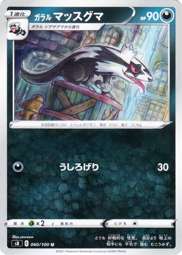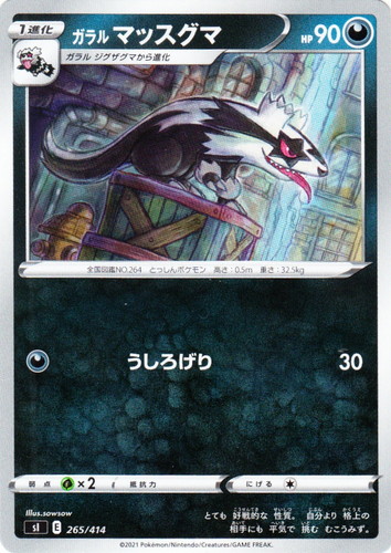 ![]() ![]() | SV4a 120 マニューラ ポケモン スカーレット&バイオレット ハイクラスパック シャイニートレジャーex (ミラー) タイプ:悪 分類:1進化 HP:110 レギュレーション:G ニューラから進化 【特性】アサルトハント 自分の番に、このポケモンがベンチからバトル場に出たとき、1回使える。相手のベンチのたねポケモンを1匹選び、バトルポケモンと入れ替える。 [悪][無色] スラッシュクロー 70 弱点:草×2 にげる:[無色] 全国図鑑NO.0461 かぎづめポケモン 高さ:1.1m 重さ:34.0kg 進化して さらに ずる賢くなり ツメで 石に サインをつけて コミュニケーションを はかっている。 illust:saino misaki |