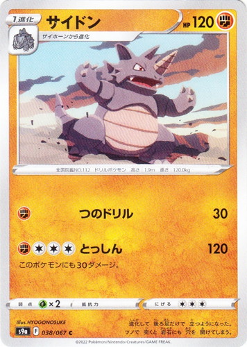 ![]() ![]() | No.111 サイホーン ポケモン ポケットモンスターカードゲーム 第2弾 拡張パック ポケモンジャングル ● タイプ:闘 分類:たね LV:18 HP:70 [無色] にらみつける コインを投げて「おもて」なら「にらみつける」を受けた相手の対戦ポケモンは、次の相手の番にワザをつかえない。 [闘][無色][無色] つのでつく 30 にげる:[無色][無色][無色] 弱点:草 抵抗力:雷 ダメージ-30 とげとげポケモン:身長1m、体重115kg 頭は悪いが力は強く、高層ビルも体当たりでコナゴナに粉砕する。 illust:Mitsuhiro Arita |
