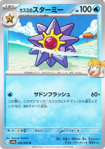 ![]() ![]() | SV4a 073 ケーシィ ポケモン スカーレット&バイオレット ハイクラスパック シャイニートレジャーex タイプ:超 分類:たね HP:50 レギュレーション:G [超] サイコショット 20 弱点:悪×2 抵抗力:闘-30 にげる:[無色] 全国図鑑NO.0063 ねんりきポケモン 高さ:0.9m 重さ:19.5kg 眠ったまま テレポート できる。 眠りが 深いほど 離れた 場所に 移動する という。 illust:Mitsuhiro Arita |