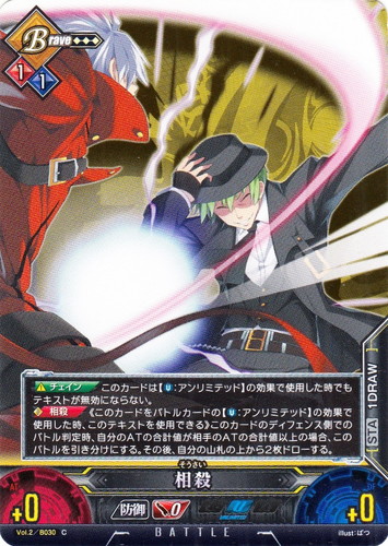 ![]() ![]() | Vol.2/B030 相殺 バトル ブレイブルーTCG Unlimited VS ブースターパック Vol.2 C 属性:Brave 攻撃力:+0 防御力:+0 DP:0 技属性:防御 使用条件:ブレイズ1/ブルー1 アイコン:アンリミテッド 【チェイン】このカードは【U:アンリミテッド】の効果で使用した時でもテキストが無効にならない。 【相殺】《このカードをバトルカードの【U:アンリミテッド】の効果で使用した時、このテキストを使用できる》このカードのディフェンス側でのバトル判定時、自分のATの合計値が相手のATの合計値以上の場合、このバトルを引き分けにする。その後、自分の山札の上から2枚ドローする。 【STA】1DRAW illust:ばつ 作品名:ブレイブルー |