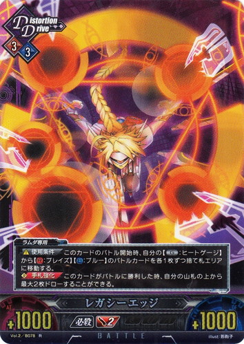 ![]() ![]() | Vol.2/B078 レガシーエッジ バトル ブレイブルーTCG Unlimited VS ブースターパック Vol.2 R 属性:Distortion Drive 攻撃力:1000 防御力:1000 DP:2 技属性:必殺 使用条件:ブレイズ3/ブルー3 ラムダ専用 【使用条件】このカードのバトル開始時、自分の【G:ヒートゲージ】から【Y:ブレイブ】【R:ブレイズ】【B:ブルー】のバトルカードを各1枚ずつ捨て札エリアに移動する。 【手札強化】このカードがバトルに勝利した時、自分の山札の上から最大2枚ドローすることができる。 illust:影胞子 作品名:ブレイブルー |