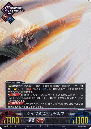 ![]() ![]() | Vol.2/B081 シュツルム・ヴォルフ バトル ブレイブルーTCG Unlimited VS ブースターパック Vol.2 R 属性:Distortion Drive 攻撃力:1300 防御力:1300 DP:2 技属性:必殺 使用条件:ブレイズ4/ブルー4 ヴァルケンハイン専用 【使用条件】このカードのバトル開始時、自分の【G:ヒートゲージ】から【Y:ブレイブ】【R:ブレイズ】【B:ブルー】のバトルカードを各1枚ずつ捨て札エリアに移動する。 【強化】自分の【EXゲージ】にカードがある時、このカードに[AT+600]する。また、自分の【EXゲージ】にカードがない時、このカードに[DF+600]する。 【手札強化】このカードがバトルに勝利した時、自分の山札の上から最大3枚ドローすることができる。 illust:おぶい 作品名:ブレイブルー |