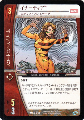 ![]() ![]() | MAV-055 イナーティア キャラクター MARVEL AVENGERS バージョン:エディス・フレイバーグ 色:赤 チーム属性:スコードロン・スプリーム コスト:3 ATK:5 DEF:3 アイコン:レンジ 予備軍 カードを1枚ディスカードする→キャラクター1体を対象とする。そのコントローラーは、それを違う位置に移動する。この能力は各ターンに1度のみ使用できる。 私はただあなたの運動エネルギーをあなた自身にぶつけるだけでいいの。 illust:BRANDON PETERSON |