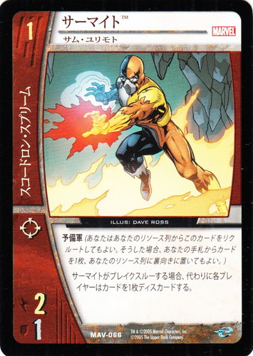 ![]() ![]() | MAV-066 サーマイト キャラクター MARVEL AVENGERS バージョン:サム・ユリモト 色:赤 チーム属性:スコードロン・スプリーム コスト:1 ATK:2 DEF:1 アイコン:レンジ 予備軍(あなたはあなたのリソース列からこのカードをリクルートしてもよい。そうした場合、あなたの手札からカードを1枚、あなたのリソース列に裏向きに置いてもよい。) サーマイトがブレイクスルーする場合、代わりに各プレイヤーはカードを1枚ディスカードする。 illust:DAVE ROSS |