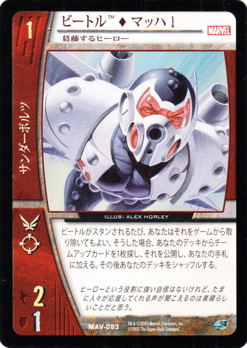 ![]() ![]() | MAV-084 ビートル◆マッハ2 キャラクター MARVEL AVENGERS バージョン:マシュー・デイビス 色:赤 チーム属性:サンダーボルツ コスト:3 ATK:5 DEF:3 アイコン:飛行/レンジ ビートルはあなたがリソースを6枚以上コントロールしているかぎり、+4 ATK/+4 DEFを得る。 サンダーボルツがマスターズ・オブ・イーブルに攻撃されて後、エイブは新しい身分を確保しなければならなかった。 illust:PHIL NOTO |