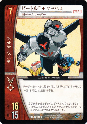 ![]() ![]() | MAV-086 ビートル◆マッハ4 キャラクター MARVEL AVENGERS バージョン:新チームリーダー 色:赤 チーム属性:サンダーボルツ コスト:7 ATK:16 DEF:15 アイコン:飛行/レンジ リーダー:ビートルに隣接するコストが4以下のキャラクターは+3 ATK/+3 DEFを得る。 私は尊敬を集めるためビートルになった。そして、いかにして尊敬を得るのかを学ぶためにサンダーボルツに入らなければならなかった。 illust:CORY WALKER |