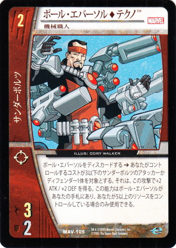 ![]() ![]() | MAV-105 ポール・エバーソル◆テクノ キャラクター MARVEL AVENGERS バージョン:機械職人 色:赤 チーム属性:サンダーボルツ コスト:2 ATK:3 DEF:2 アイコン:レンジ ポール・エバーソルをディスカードする→あなたがコントロールするコストが3以下のサンダーボルツのアタッカーかディフェンダー1体を対象とする。それは、この攻撃で+2 ATK/+2 DEFを得る。この能力はポール・エバーソルがあなたの手札にあり、あなたが5以上のリソースをコントロールしている場合のみ使用できる。 illust:CORY WALKER |