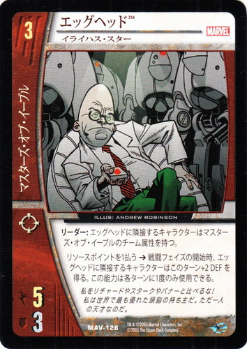 ![]() ![]() | MAV-126 エッグヘッド キャラクター MARVEL AVENGERS バージョン:イライハス・スター 色:赤 チーム属性:マスターズ・オブ・イーブル コスト:3 ATK:5 DEF:3 アイコン:レンジ リーダー:エッグヘッドに隣接するキャラクターはマスターズ・オブ・イーブルのチーム属性を持つ。 リソースポイントを1払う→戦闘フェイズの開始時、エッグヘッドに隣接sるうキャラクターはこのターン+2 DEFを得る。この能力は各ターンに1度のみ使用できる。 私をリチャードやスタークやバナーと比べるな! 私は世界で最も優れた頭脳の持ち主だ。ただ一人の天才なのだ。 illust:ANDREW ROBINSON |