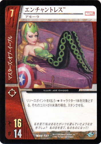 ![]() ![]() | MAV-127 エンチャントレス キャラクター MARVEL AVENGERS バージョン:アモーラ 色:赤 チーム属性:マスターズ・オブ・イーブル コスト:7 ATK:16 DEF:14 アイコン:レンジ リソースポイントをX払う→キャラクター1体を対象とする。それのコストがX未満の場合、スタンさせる。 私を見て!私はあなたがいつも望んでいたような女性でしょ?私の目を見て、私のものになって! illust:JOE CHIODO |