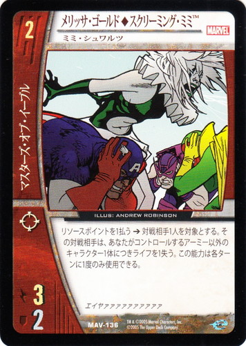 ![]() ![]() | MAV-136 メリッサ・ゴールド◆スクリーミング・ミミ キャラクター MARVEL AVENGERS バージョン:ミミ・シュワルツ 色:赤 チーム属性:マスターズ・オブ・イーブル コスト:2 ATK:3 DEF:2 アイコン:レンジ リソースポイントを1払う→対戦相手1人を対象とする。その対戦相手は、あなたがコントロールするアーミー以外のキャラクター1体につきライフを1払う。この能力は各ターンに1度のみ使用できる。 エイヤァァァァァァァァァァ illust:ANDREW ROBINSON |