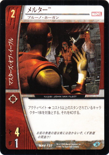 ![]() ![]() | MAV-137 メルター キャラクター MARVEL AVENGERS バージョン:ブルーノ・ホーガン 色:赤 チーム属性:マスターズ・オブ・イーブル コスト:2 ATK:4 DEF:1 アイコン:レンジ アクティベイト→コスト5以上のスタンされているキャラクター1体を対象とする。それをKOする。 お前の無敵の鎧は俺には効かないぞ、くず鉄鎧の間抜け! illust:JOHN VAN FLEET |