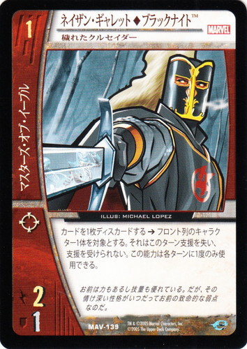 ![]() ![]() | MAV-139 ネイザン・ギャレット◆ブラックナイト キャラクター MARVEL AVENGERS バージョン:穢れたクルセイダー 色:赤 チーム属性:マスターズ・オブ・イーブル コスト:1 ATK:2 DEF:1 アイコン:レンジ カードを1枚ディスカードする→フロント列のキャラクター1体を対象とする。それはこのターン支援を失い、支援を受けられない。この能力は各ターンに1度のみ使用できる。 お前は力もあるし技量も優れている。だが、その情け深い性格がいつだってお前の致命的な弱点なのだ。 illust:MICHAEL LOPEZ |