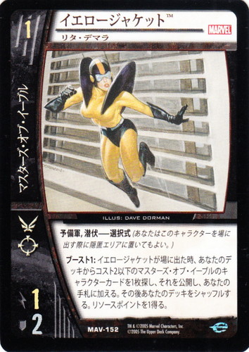 ![]() ![]() | MAV-152 イエロージャケット キャラクター MARVEL AVENGERS バージョン:リタ・デマラ 色:黒 チーム属性:マスターズ・オブ・イーブル コスト:1 ATK:1 DEF:2 アイコン:飛行/レンジ 予備軍, 潜伏-選択式(あなたはこのキャラクターを場に出す際に隠匿エリアに置いてもよい。) ブースト1:イエロージャケットが場に出た時、あなたのデッキからコスト2以下のマスターズ・オブ・イーブルのキャラクターカードを1枚探し、それを公開し、あなたの手札に加える。そのあなたのデッキをシャッフルする。リソースポイントを1得る。 illust:DAVE DORMAN |