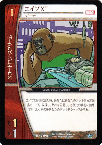 ![]() ![]() | MAV-045 エイプX キャラクター MARVEL AVENGERS バージョン:ジーナ 色:赤 チーム属性:スコードロン・スプリーム コスト:1 ATK:1 DEF:1 エイプXが場に出た時、あなたはあなたのデッキから装備品カードを1枚探し、それを公開し、あなたの手札に加えてもよい。その後あなたのデッキをシャッフルする。 illust:CULLY HAMNER |