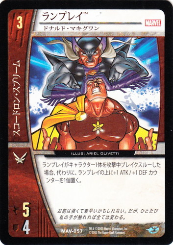 ![]() ![]() | MAV-057 ランプレイ キャラクター MARVEL AVENGERS バージョン:ドナルド・マキグワン 色:赤 チーム属性:スコードロン・スプリーム コスト:3 ATK:5 DEF:4 アイコン:飛行 ランプレイがキャラクター1体を攻撃中ブレイクスルーした場合、代わりに、ランプレイの上に+1 ATK/+1 DEFカウンターを1個置く。 お前は強くて素早いかもしれない。だが、ひとたび私の手が触れれば全ては変わる。 illust:ARIEL OLIVETTI |