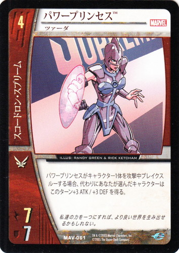 ![]() ![]() | MAV-061 パワープリンセス キャラクター MARVEL AVENGERS バージョン:ツァーダ 色:赤 チーム属性:スコードロン・スプリーム コスト:4 ATK:7 DEF:7 アイコン:飛行 パワープリンセスがキャラクター1体を攻撃中ブレイクスルーする場合、代わりにあなたが選んだキャラクターはこのターン+3 ATK/+3 DEFを得る。 私達の力を一つにすれば、より良い世界を生み出せるかもしれない。 illust:RANDY GREEN&RICK KET |