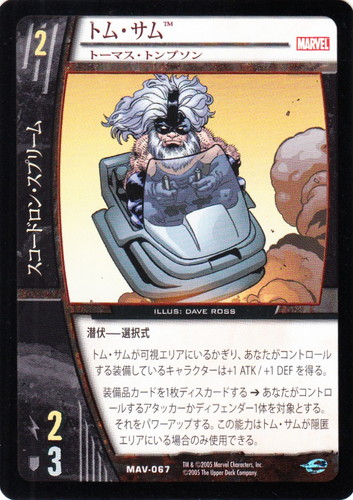 ![]() ![]() | MAV-067 トム・サム キャラクター MARVEL AVENGERS バージョン:トーマス・トンプソン 色:黒 チーム属性:スコードロン・スプリーム コスト:2 ATK:2 DEF:3 潜伏-選択式 トム・サムが可視エリアにいるかぎり、あなたがコントロールする装備しているキャラクターは+1 ATK/+1 DEFを得る。 装備品カードを1枚ディスカードする→あなたがコントロールするアタッカーがディフェンダー1体を対象とする。それをパワーアップする。この能力はトム・サムが隠匿エリアにいる場合のみ使用できる。 illust:DAVE ROSS |