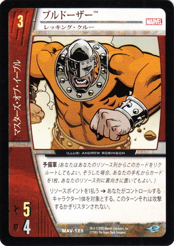 ![]() ![]() | MAV-125 ブルドーザー キャラクター MARVEL AVENGERS バージョン:レッキング・クルー 色:赤 チーム属性:マスターズ・オブ・イーブル コスト:3 ATK:5 DEF:4 予備軍(あなたはあなたのリソース列からこのカードをリクルートしてもよい。そうした場合、あなたの手札からカードを1枚、あなたのリソース列に裏向きに置いてもよい。) リソースポイントを1払う→あなたがコントロールするキャラクター1体を対象とする。このターンそれは攻撃するかぎりスタンされない。 illust:ANDREW ROBINSON |