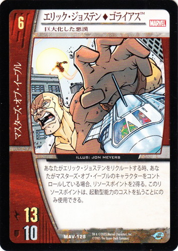 ![]() ![]() | MAV-128 エリック・ジョステン◆ゴライアス キャラクター MARVEL AVENGERS バージョン:巨大化した悪漢 色:赤 チーム属性:マスターズ・オブ・イーブル コスト:6 ATK:13 DEF:10 あなたがエリック・ジョステンをリクルートする時、あなたがマスターズ・オブ・イーブルのキャラクターをコントロールしている場合、リソースポイントを2得る。このリソースポイントは、起動型能力のコストを払うことにのみ使用できる。 illust:JON MEYERS |
