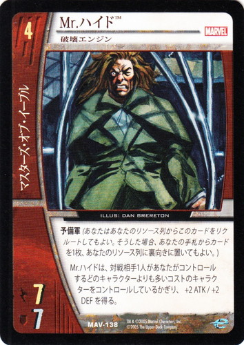 ![]() ![]() | MAV-138 Mr.ハイド キャラクター MARVEL AVENGERS バージョン:破壊エンジン 色:赤 チーム属性:マスターズ・オブ・イーブル コスト:4 ATK:7 DEF:7 予備軍(あなたはあなたのリソース列からこのカードをリクルートしてもよい。そうした場合、あなたの手札からカードを1枚、あなたのリソース列に裏向きに置いてもよい。) Mr.ハイドは、対戦相手1人があなたがコントロールするどのキャラクターよりも多いコストのキャラクターをコントロールしているかぎり、+2 ATK/+2 DEFを得る。 illust:DAN BRERETON |