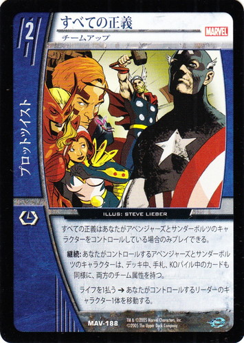 継続:あなたがコントロールするアベンジャーズスコードロン・スプリームのキャラクターは、デッキ中、手札、KOパイル中のカードも同様に、両方のチーム属性を持つ。