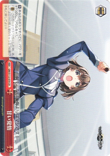 ![]() ![]() | GF/W38-069 放課後デート クライマックス ブースターパック ガールフレンド(仮) Vol.2 CC 色:赤 トリガー:ソウル/ソウル 【永】あなたのキャラすべてに、ソウルを+2。 こんなところで、どうしたのですか? ワタシの方こそ?ワタシはお散歩ですヨ 作品名:ガールフレンド(仮) |