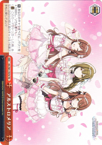 ![]() ![]() | ISC/S81-T076 アルストロメリア クライマックス トライアルデッキ+ アイドルマスター シャイニーカラーズ 283プロ アルストロメリア TD 色:赤 トリガー:カムバック 【永】あなたのキャラすべてに、パワーを+1000し、ソウルを+1。 (【カムバック】:このカードがトリガーした時、あなたは自分の控え室のキャラを1枚選び、手札に戻してよい) 作品名:アイドルマスター シャイニーカラーズ |