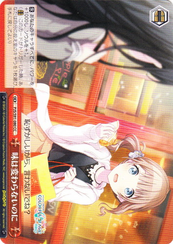 ![]() ![]() | PJS/S91-080 味は変わらないのに クライマックス ブースターパック プロジェクトセカイ カラフルステージ! feat. 初音ミク CC 色:赤 トリガー:カムバック 【永】あなたのキャラすべてに、パワーを+1000し、ソウルを+1。 (【カムバック】:このカードがトリガーした時、あなたは自分の控え室のキャラを1枚選び、手札に戻してよい) 恥ずかしいから、言わないでね? 作品名:プロジェクトセカイ カラフルステージ! feat. 初音ミク |