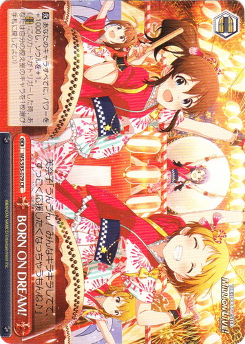 ![]() ![]() | IMS/S93-079 BORN ON DREAM! クライマックス ブースターパック アイドルマスター ミリオンライブ! Welcome to the New St@ge CR 色:赤 トリガー:カムバック 【永】あなたのキャラすべてに、パワーを+1000し、ソウルを+1。 (【カムバック】:このカードがトリガーした時、あなたは自分の控え室のキャラを1枚選び、手札に戻してよい) 美奈子「うんうん!みんなキラキラしてて、すっごく応援したくなっちゃうもんね♪」 作品名:アイドルマスター ミリオンライブ! |