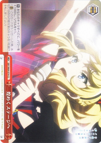 ![]() ![]() | RSL/S98-046 競演のレヴュー クライマックス ブースターパック 劇場版 少女☆歌劇 レヴュースタァライト CC 色:緑 トリガー:トレジャー 【永】あなたのキャラすべてに、パワーを+1000し、ソウルを+1。 (【トレジャー】:このカードがトリガーした時、あなたはこのカードを手札に戻す。あなたは自分の山札の上から1枚を、ストック置場に置いてよい) まひる「誰より強い、キラめきを!!」 作品名:劇場版 少女☆歌劇 レヴュースタァライト |