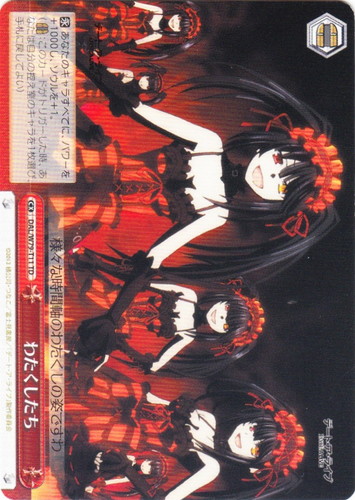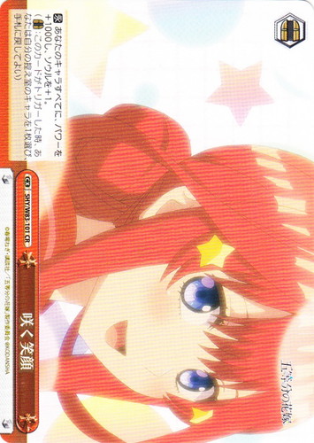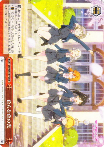 ![]() ![]() | LL/W24-112a 僕らは今のなかで クライマックス トライアルデッキ ラブライブ! TD 色:黄 トリガー:ソウル/ソウル 【自】このカードが手札からクライマックス置場に置かれた時、あなたは1枚引き、自分のキャラを1枚選び、そのターン中、パワーを+2000し、ソウルを+1。 集まったら強い自分になってくよ きっとね 変わり続けて 作品名:ラブライブ! School idol project |