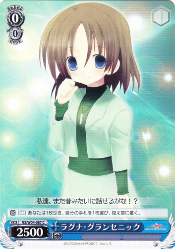 ![]() ![]() | NS/W04-087 ラグナ・グランセニック キャラ ブースターパック なのはStrikerS C 色:青 レベル:0 コスト:0 パワー:2500 ソウル:1 【起】[①]あなたは1枚引き、自分の手札を1枚選び、控え室に置く。 私達、また昔みたいに話せるかな!? 作品名:魔法少女リリカルなのはStrikerS illust:しろ |