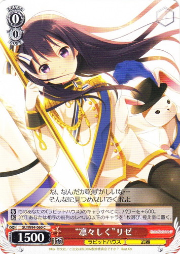 ![]() ![]() | GU/W94-060 “凛々しく” リゼ キャラ ブースターパック ご注文はうさぎですか? Re:Edit C 色:赤 レベル:0 コスト:0 パワー:1500 ソウル:1 特徴:ラビットハウス/武器 【永】他のあなたの《ラビットハウス》のキャラすべてに、パワーを+500。 【起】[①]あなたは相手の前列のレベル0以下のキャラを1枚選び、控え室に置く。 な、なんだか恥ずかしいな・・・ そんなに見つめないでくれよ 作品名:ご注文はうさぎですか?? illust:Koi |