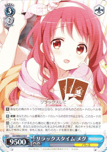 ![]() ![]() | GU/W94-078 リラックスタイム メグ キャラ ブースターパック ご注文はうさぎですか? Re:Edit R 色:青 レベル:3 コスト:2 パワー:9500 ソウル:2 特徴:バレエ トリガー:ソウル 【永】あなたの青のキャラが4枚以上なら、あなたの手札のこのカードのレベルを-1。 【永】経験 あなたのレベル置場のカードのレベルの合計が6以上なら、このカードのパワーを+1500。 【自】このカードが手札から舞台に置かれたターン中、このカードのバトル相手が「リバース」した時、あなたは自分の山札を上から4枚まで見て、青のキャラを2枚まで選んで相手に見せ、手札に加え、残りのカードを控え室に置く。 リラックスして 作品名:ご注文はうさぎですか? BLOOM illust:Koi |