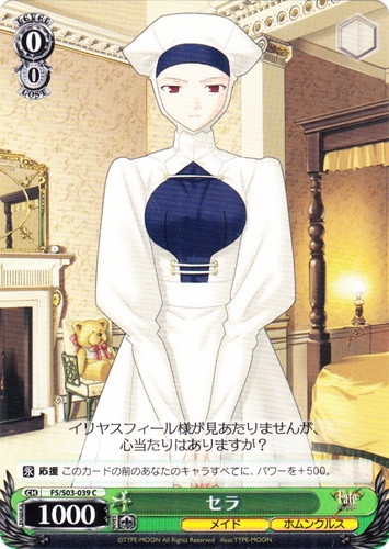 ![]() ![]() | FS/S03-039 セラ キャラ ブースターパック Fate/stay night C 色:緑 レベル:0 コスト:0 パワー:1000 ソウル:1 特徴:メイド/ホムンクルス 【永】応援 このカードの前のあなたのキャラすべてに、パワーを+500。 イリヤスフィール様が見あたりませんが、心当たりはありますか? 作品名:Fate/stay night illust:TYPE-MOON |
