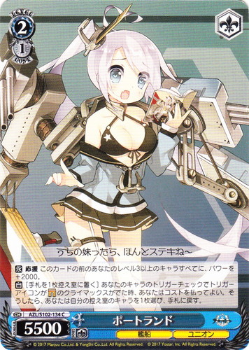 ![]() ![]() | AZL/S102-134 ポートランド キャラ ブースターパック アズールレーン C 色:青 レベル:2 コスト:1 パワー:5500 ソウル:1 特徴:艦船/ユニオン トリガー:ソウル 【永】応援 このカードの前のあなたのレベル3以上のキャラすべてに、パワーを+2000。 【自】[手札を1枚控え室に置く]あなたのキャラのトリガーチェックでトリガーアイコンが【ゲート】のクライマックスがでた時、あなたはコストを払ってよい。そうしたら、あなたは自分の控え室のキャラを1枚選び、手札に戻す。 うちの妹ったら、ほんとステキね~ 作品名:アズールレーン |